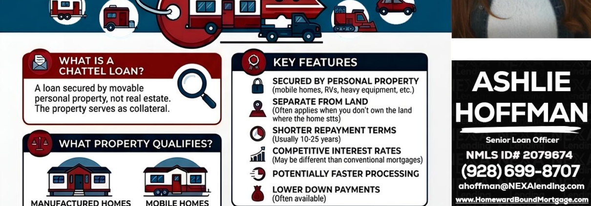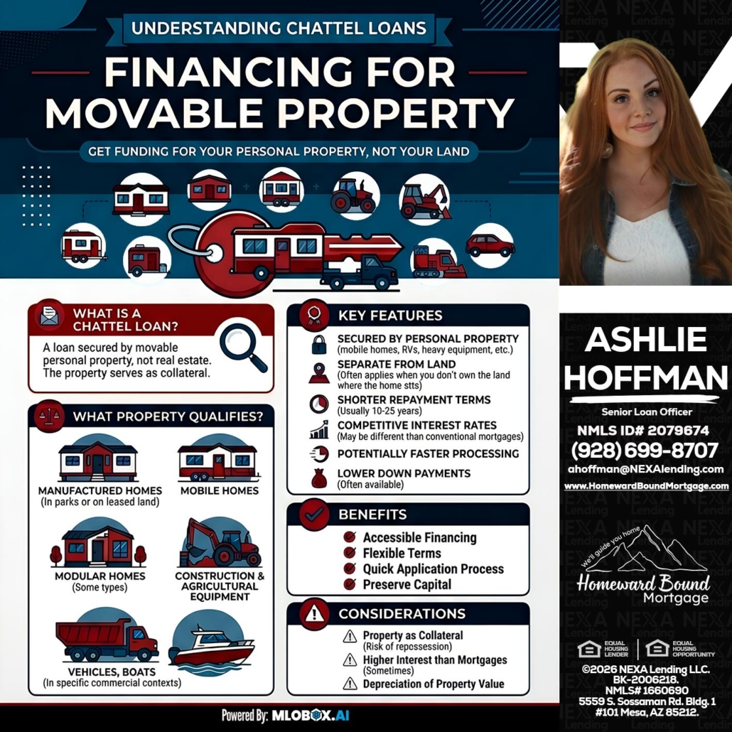Chattel Loans - Ashlie Hoffman -Senior Loan OfficerHi, my name is Ashlie Hoffman. I’m a Loan Officer offering personalized mortgage solutions, fast customized quotes, great rates and service with integrity. If you’re interested in learning more about the Chattel loan or any other, just let me know and I’ll walk you through your options.
