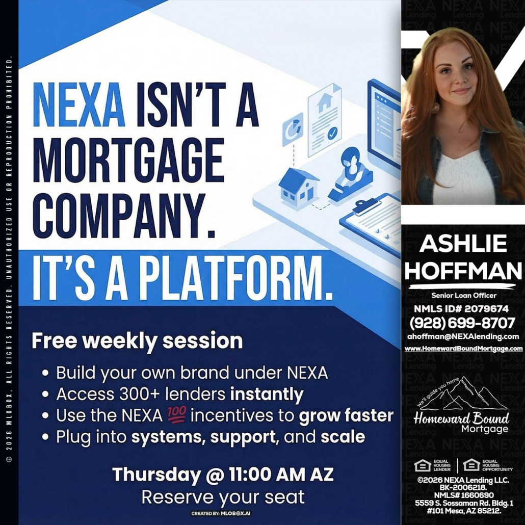 NEXA ISNT - Ashlie Hoffman -Senior Loan OfficerHi, my name is Ashlie Hoffman. I’m a Loan Officer with NEXA Lending LLC., offering personalized mortgage solutions, fast customized quotes, great rates and service with integrity.